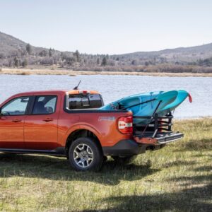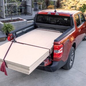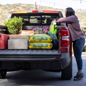 The 4.5-foot bed can carry 1,500 pounds of payload, the equivalent of roughly 37 bags of 40-pound mulch, and has a six-foot floor with the tailgate down. Maverick can carry long and wide stuff too, thanks to its multi-position tailgate. It opens normally, but also has a halfway-open position – just unclip the support cables and hook them onto the latch pins so the tailgate lip and wheelhouses can support up to 18 sheets of 4×8-foot three-quarter-inch plywood without needing to angle the panels. It’s easy. The tailgate features tie-down clamps that double as bottle openers, and is rated to hold 500 pounds of friends hanging out and taking a seat. The bed floor and sides are low, so almost any size adult can reach over and grab items off the floor.