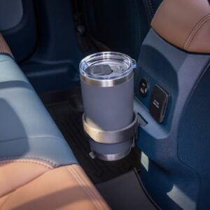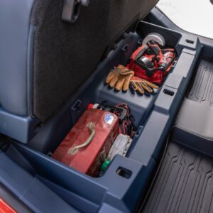 FITS – Ford Integrated Tether System – is a clever multitasking solution for rear seat passengers. There’s a FITS slot at the back of the front console that accommodates different accessories for endless personalization. An available accessory package includes cupholders, a storage or trash bin, cord organizer, double hook for grocery bags and purses, and under-seat storage dividers. More FITS slot creations are in development and Ford is working to publish the slot geometry so people can 3D-print DIY solutions to further fit their lifestyle. Those accessories can be stored in multiple slots under the rear seats, which could also be used for novel applications on their own.