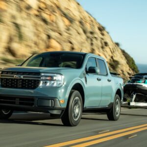 The all-new Ford Maverick is a compact truck with a unibody design and the first pickup in America with a standard full-hybrid powertrain – providing better projected city fuel economy than a Honda Civic***. Its 2.5-liter Atkinson-cycle four-cylinder hybrid powertrain delivers 191 horsepower when combined with the electric motorƗ, and 155 lb.-ft. of torque mated to a continuously variable transmission driving the front wheels. It features an in-house-designed and manufactured electric traction motor, which is light and powerful. Along with its targeted EPA-estimated fuel economy of 40 mpg city* and 500 miles of range on a single tank of gas**, it offers standard payload of 1,500 pounds and the volume to carry a standard ATV, plus it has the capability to tow 2,000 pounds – enough for a pair of personal watercraft or a good-sized pop-up camper trailer.
