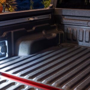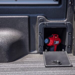 Beyond DIY electrical, there are two available 110-volt 400-watt outlets – one in the bed and one in the cabin – that can power phones, laptops, small TVs, a cordless tool battery charger, or a small, corded tool like a jigsaw. There’s also a storage cubby built into the side of the bed on XLT and two available on Lariat trucks, perfect for keeping a ball hitch or air pump.