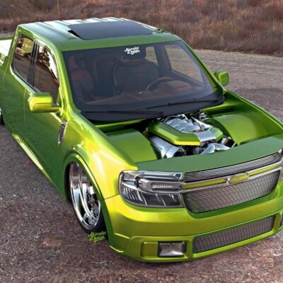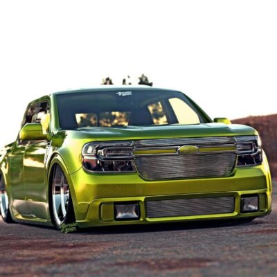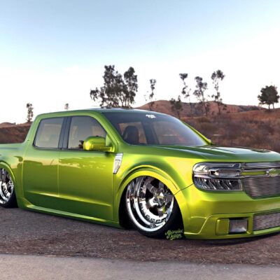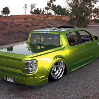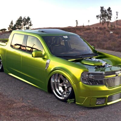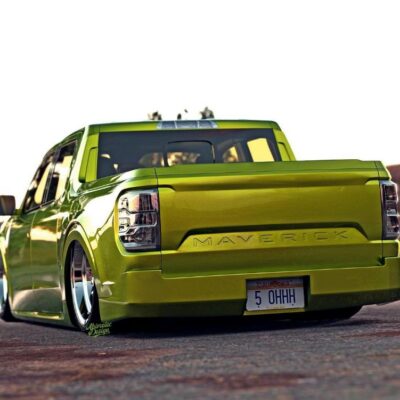 This Maverick is slammed to the ground, sitting on massive chromed Rotiform WGR-M. Wears a candy lime green with just a bit of yellow flake, shaved tailgate, doors, custom grille, custom front and rear bumper, bed cover, Lincoln Continental dashboard and seats, and while we’re on it, inside the shaved engine bay lives a 5.0 Coyote V8.