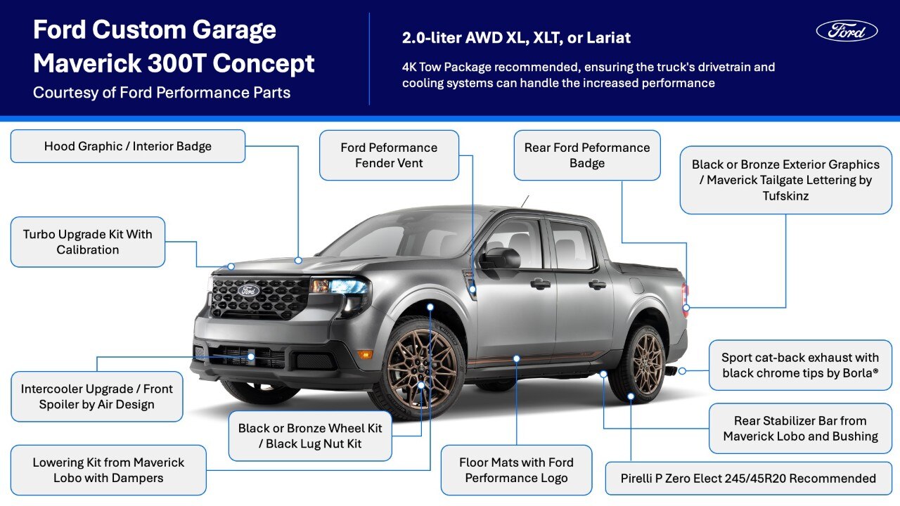 For Ford Maverick enthusiasts attending SEMA 2025, the Maverick 300T will be on display at the Ford Performance Parts booth, where visitors can see the complete package up close. For more information, visit fordcustomgarage.com